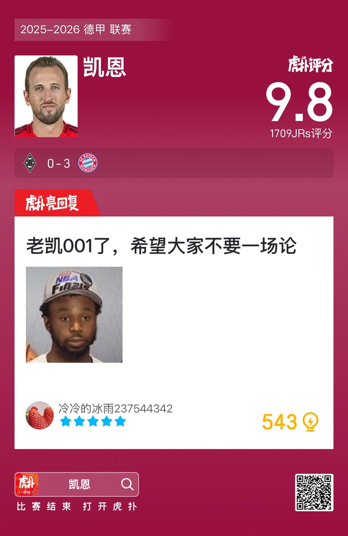 据多家媒体报道,凯恩在拜仁表现极为出色,对阵门兴一役获得虎扑9.8高分,显示了其在德甲的适应和统治力。